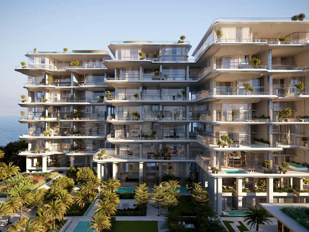 Each residence features spacious layouts, double-height ceilings, floor-to-ceiling windows, and large terraces that offer breathtaking views of the Arabian Gulf and Dubai skyline. Residents enjoy premium lifestyle amenities including a private beach club, infinity swimming pools, wellness spa, fitness center, private cinema, library lounge, and concierge services.